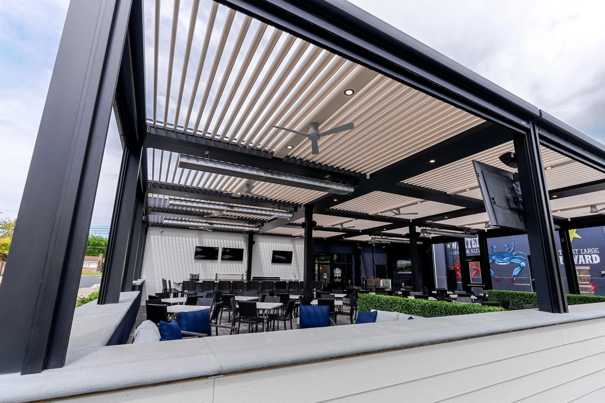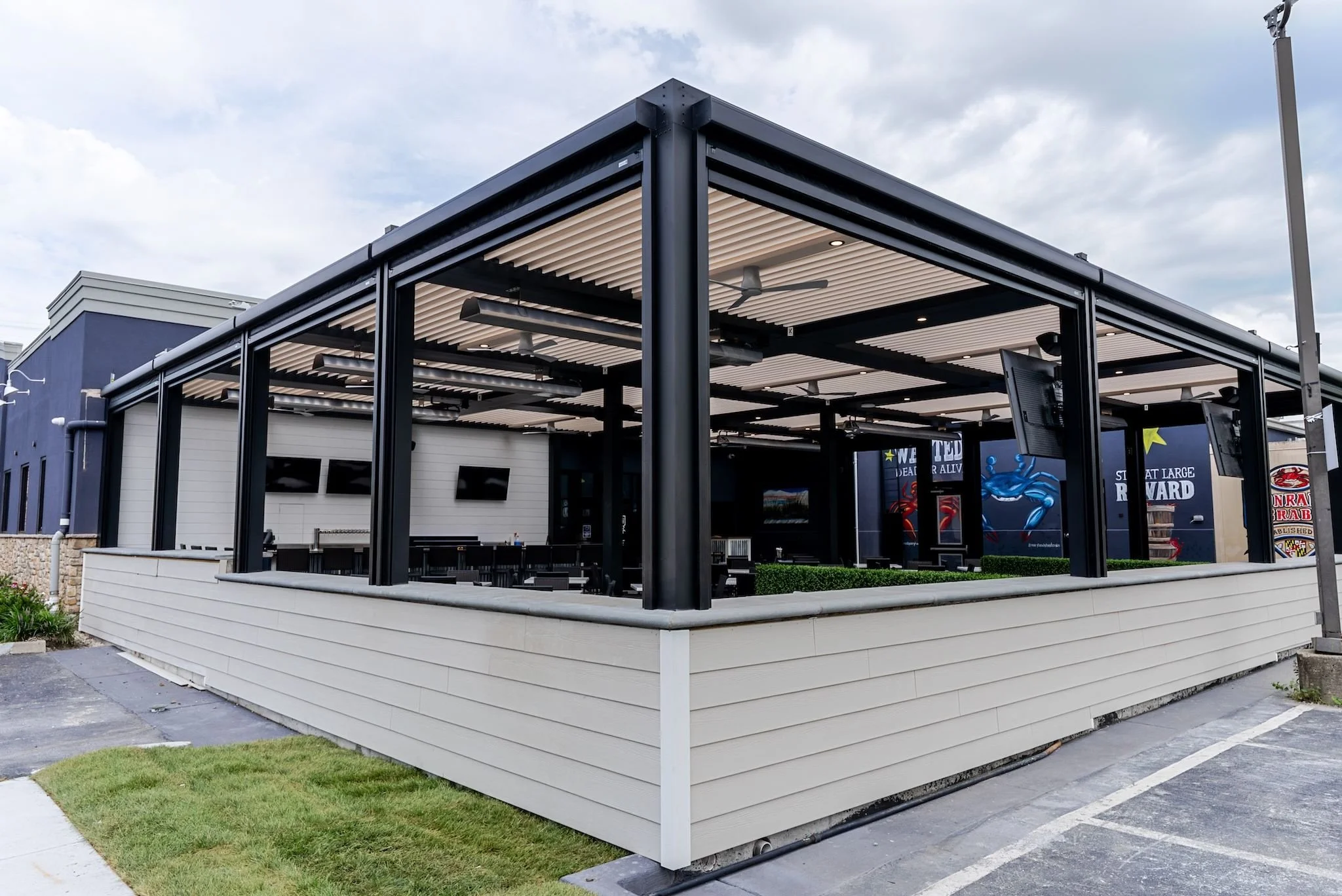 Conrad’s Crabs transformed their once underused, sun-soaked patio into a fully functional, four-season dining destination with the addition of the StruXure Pergola X. This impressive project added 115 new seats beneath 12 motorized pergola units, each equipped with solar screens for shade and comfort and clear vinyl screens to keep the space warm and protected — for the winter months.
